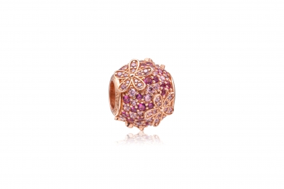 - Featuring pink and cerise man-made crystals as well as raised daisy flower details in various sizes this flower charm is hand-finished in Pandora Rose a 14k rose gold-plated unique metal blend.