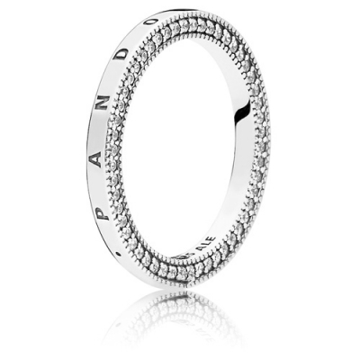 - This sterling silver ring is embellished with a PANDORA logo cut-out hearts and shimmering cubic zirconia.