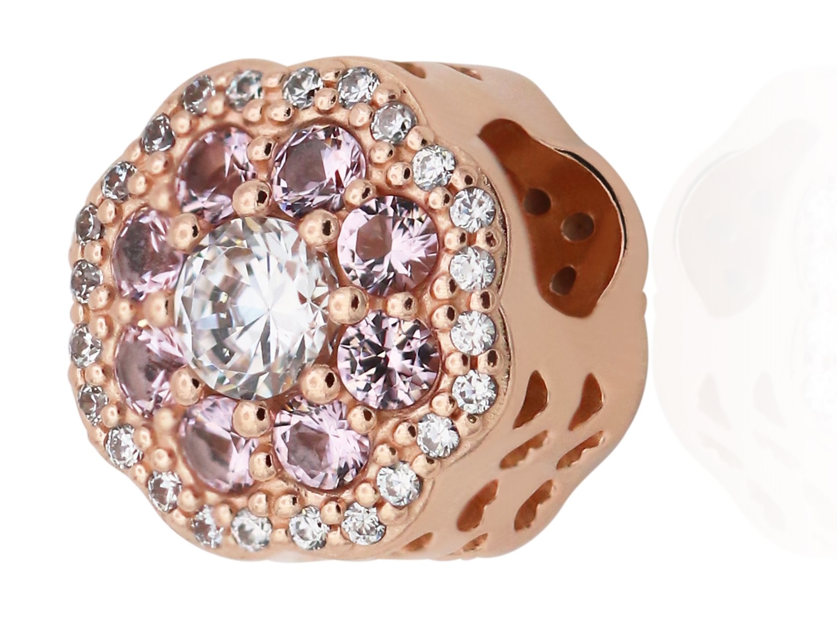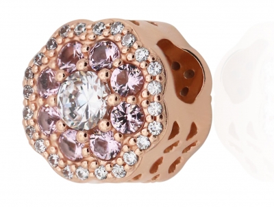 - Wear a lasting bouquet with this pretty flower charm made from blush-pink Pandora Rose and set with pink crystal petals and a halo of clear stones.
