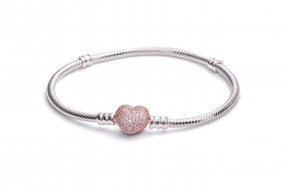 - Put some love in your look with our classic Pandora Moments Pave Heart Clasp Snake Chain Bracelet thats been given a romantic update with a heart-shaped 14k rose gold-plated clasp.