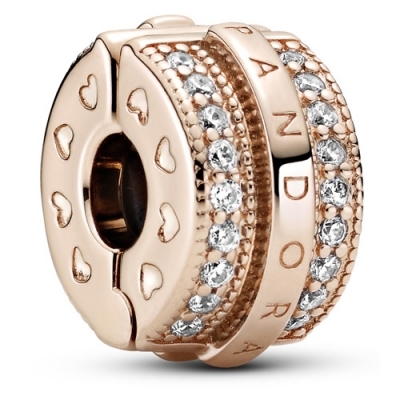 • Designed with two rows of bead-set clear cubic zirconia framed by micro-beading and a raised row with Pandora logo in the center and made in Pandora Rose (14k rose gold-plated unique metal blend) this charm can be worn to any event during any season and make a sophisticated statement.