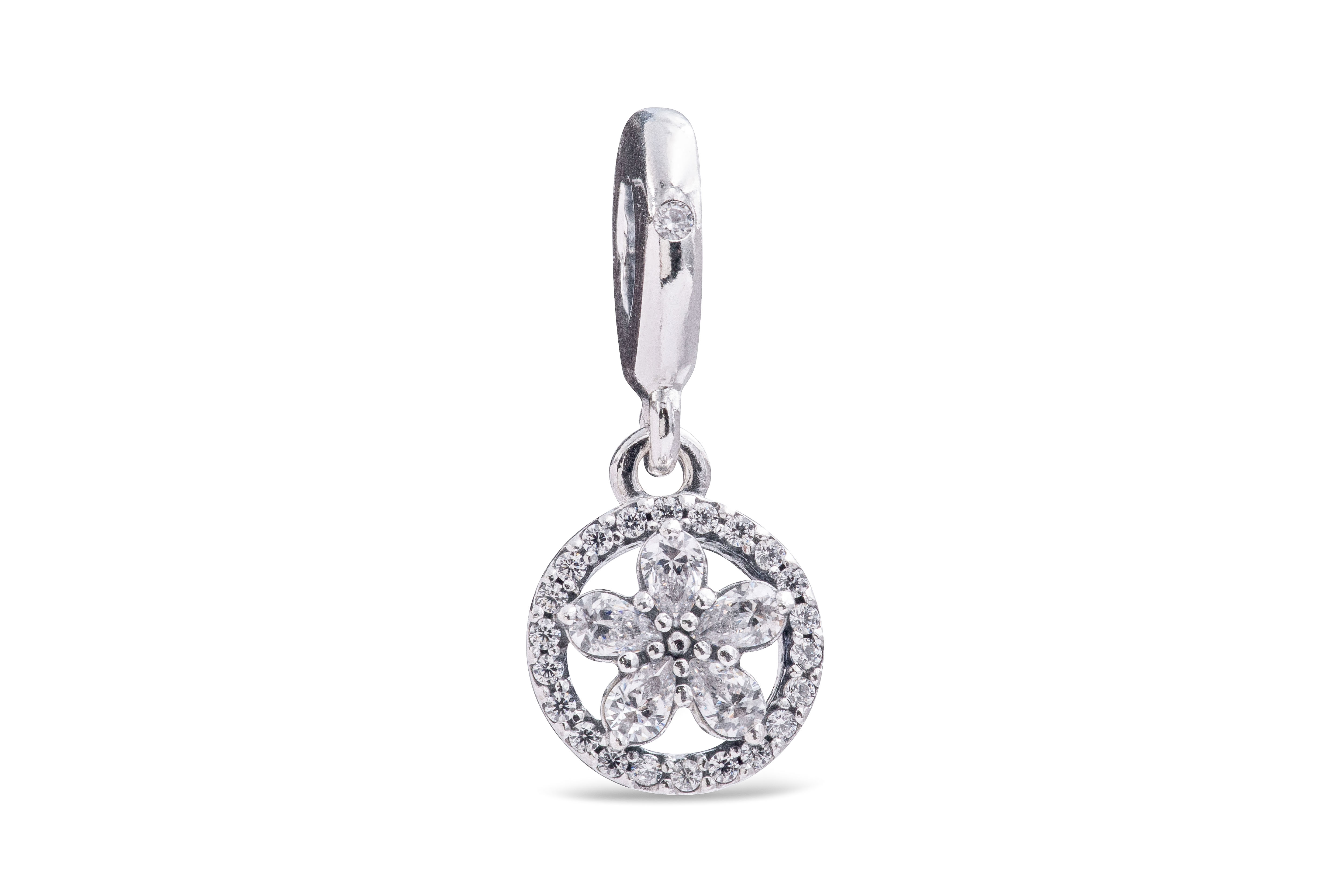 - The charm features clear stones in the form of a raised star-like snowflake formation inside a circle decorated with clear cubic zirconia.