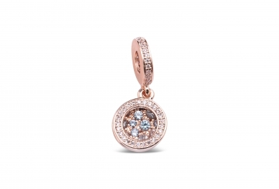 - Hand-finished in Pandora Rose (14k rose gold-plated unique metal blend) this design includes a back disc decorated with beading and aqua blue stones in various sizes.