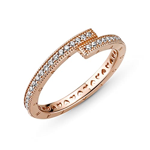 - The outer band features clear cubic zirconia pave framed by micro-beading the sides have the Pandora logo and the inner shank has cut-out hearts.