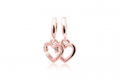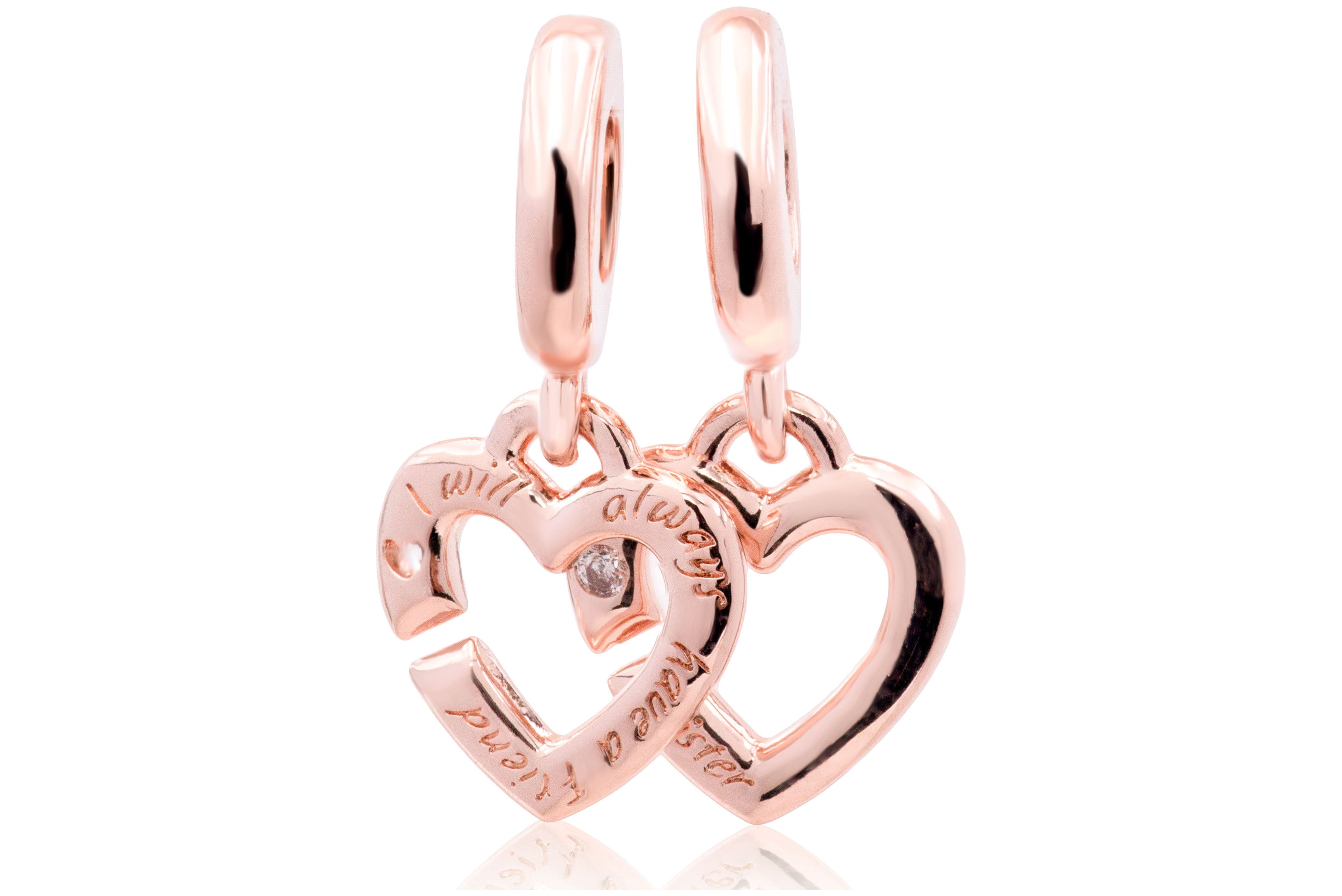 - Finished in warm 14k rose gold plating this charm includes two linked open hearts each featuring a sparkling clear cubic zirconia stone and engraving (one says Sis and the other reads Sister).