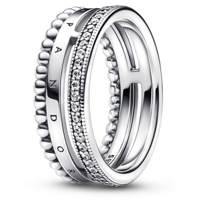 - Crafted in sterling silver the Pandora Signature Logo Pave & Beads Ring features a multi-textured look with contrasting bands of beads and Pave.
