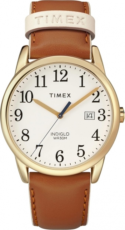 - The watch features an adjustable brown leather strap with light pink accents a cream dial with a date window and full Arabic numerals a gold-tone brass case with mineral crystal and is water-resistant up to 30 meters.