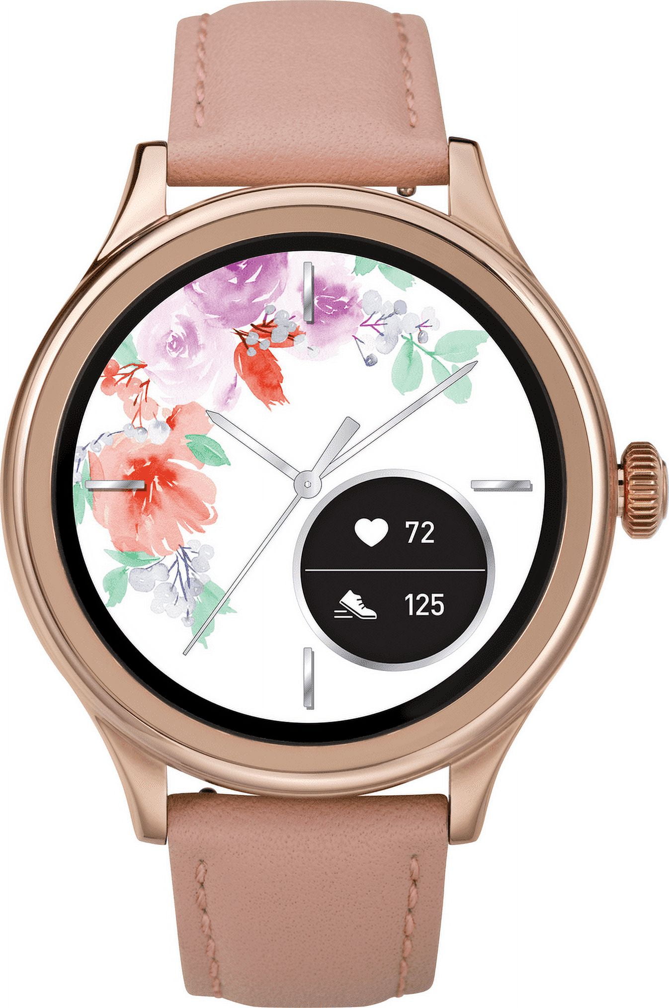 - Thanks to the vibrant touchscreen and custom watch faces this is your everyday dressed up option featuring a 43mm rose gold case and pink leather strap.