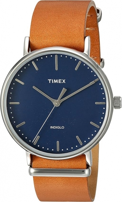 - The 41mm Fairfield watch is the ultimate expression of clean minimalist style set in a silver-tone case with a sharp blue dial and a contrasting tan leather strap.
