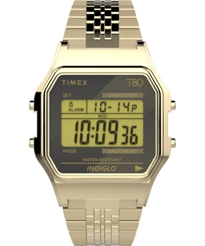 • Step back in time with the 34mm Timex 80 featuring an unmistakable gold-tone bracelet and a digital display with a black lens.