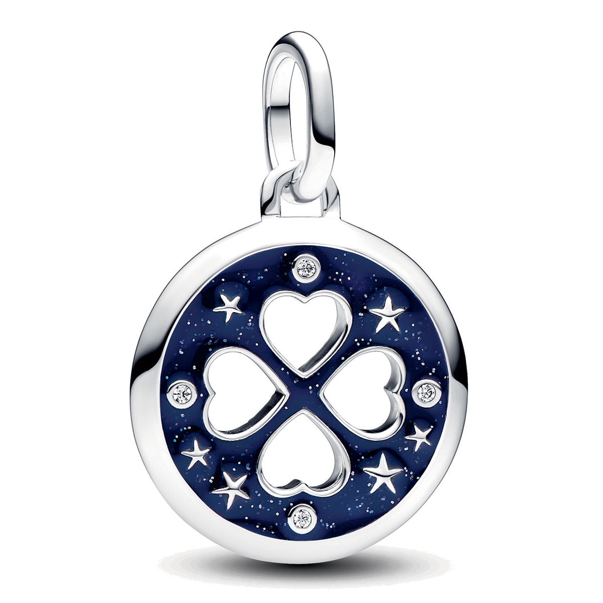 - This modern amulet radiates love and luck with four cut-out hearts forming a four-leaf clover shape surrounded by glittery deep blue enamel clear stones and raised stars.