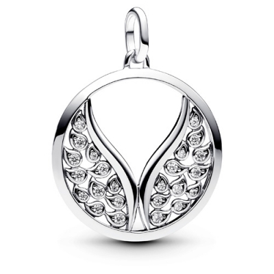 - Featuring a set of angel-inspired wings within a round outline this sterling silver design sparkles with dozens of tiny stones set within drop shapes.