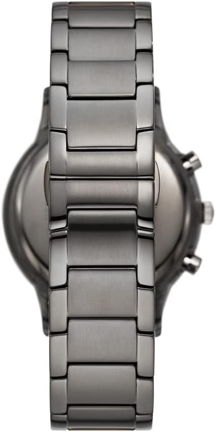 - Emporio Armanis 43mm watch features a gradient sunray dial from black to grey with cd finishing on external dial ring chronograph movement stainless steel case and gunmetal stainless steel bracelet.
