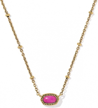 - Set with Dark Fuchsia Variegated Magnesite on a textured satellite chain this necklace is plated in Vintage 23k Yellow Gold Over Brass and is perfect for a minimal aesthetic or for adding color to layers.