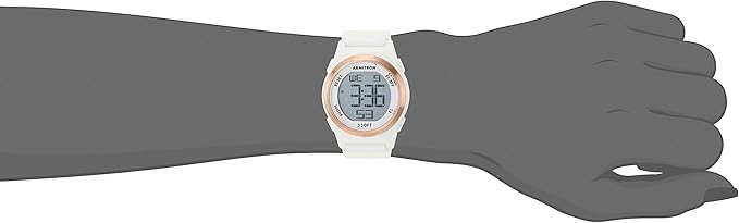 - Matte white resin case with a rose gold-tone stainless steel top ring.