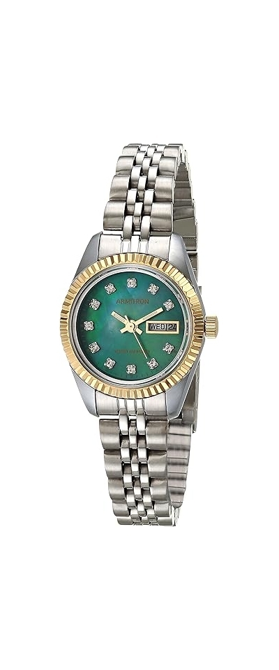 - Dial: Green mother-of-pearl with day/date calendar window gold-tone luminous hands and genuine clear crystal markers.