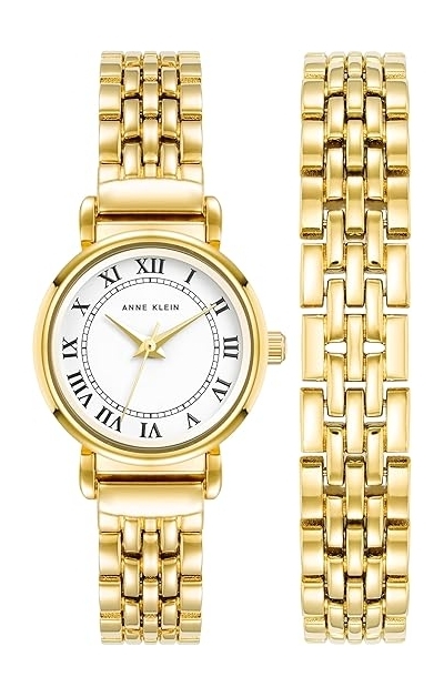 - Dial: White glossy with gold-tone hands black Roman numerals and minute track.