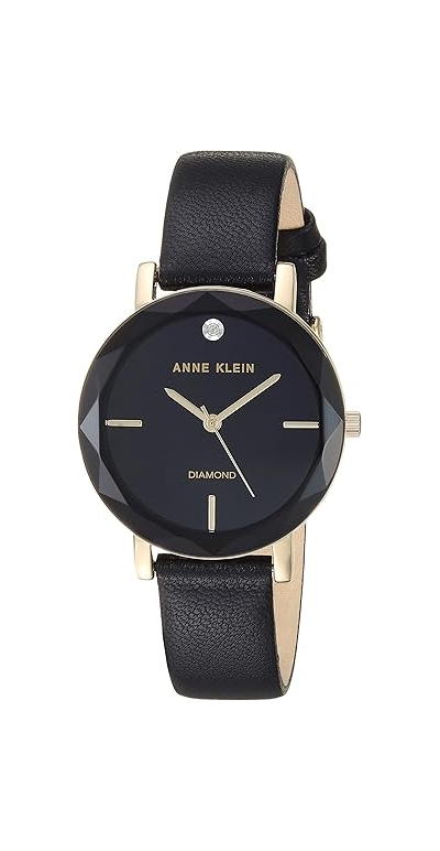 Anne Klein Genuine Diamond Dial Gold-Tone and Black Leather Strap Ladies Watch