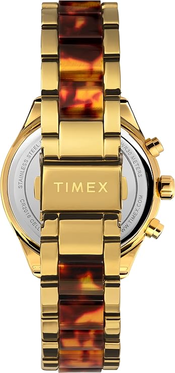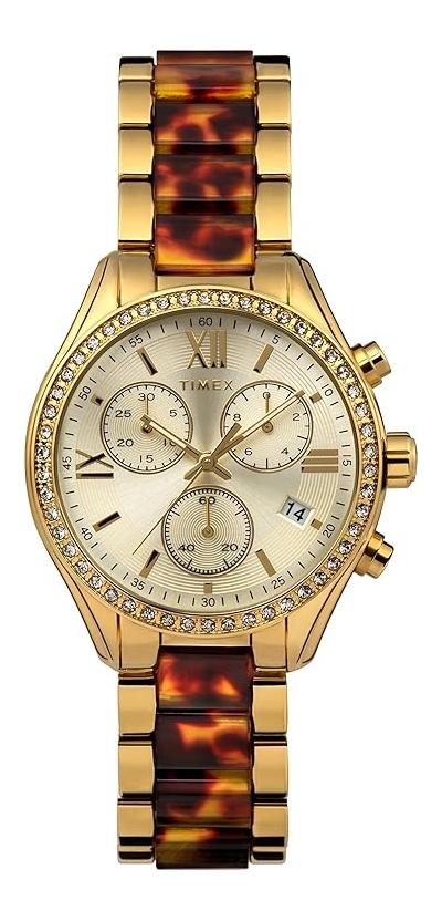 - Case: Gold-tone alloy steel case with a two-tone (gold-tone and tortoise) alloy steel bracelet.
