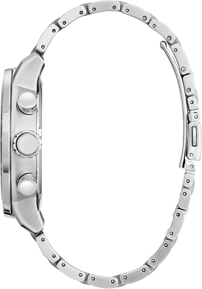 - Protected by a scratch-resistant mineral crystal the watch is paired with a silver-tone stainless steel bracelet with a 22mm strap width that secures via a fold-over clasp with a safety release.