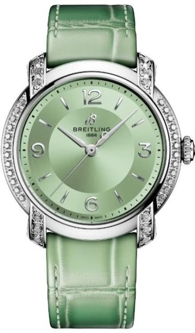 - The elegant Breitling Lady Premier Automatic 36 is designed for refined wear featuring a slender 36 mm stainless steel case with a thickness of just 9.9 mm and a striking Green dial.