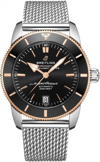 - The elegant Breitling Superocean Heritage Automatic 42 features a 42 mm two-tone case (14.35 mm thickness) crafted from stainless steel and 18k red gold defined by its ratcheted bezel and a sleek Black dial.