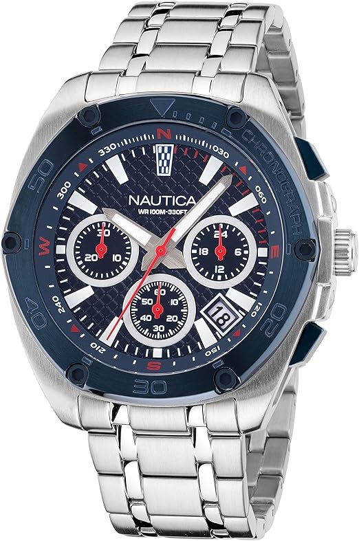 - The robust 11.4 mm thick case houses a vibrant blue dial equipped with a chronograph movement three subdials and a date window at 3 o clock all protected by a mineral glass crystal.