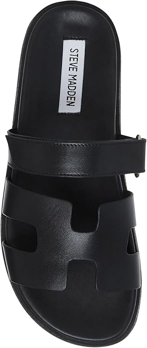 - The leather MAYVEN slides feature comfy construction details like a molded footbed a treaded flatform sole and an adjustable top strap plus a front strap with a geometric cutout design.