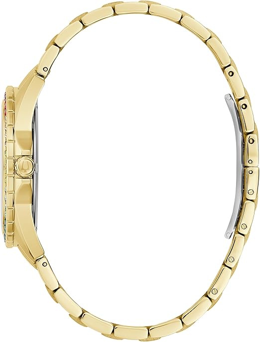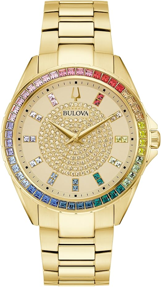 - The magnificent gold-tone stainless steel case is set with a rainbow of colorful crystals around the bezel that dazzles in the light.
