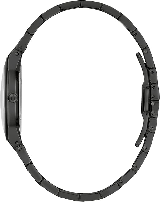 - The sleek aesthetic is completed by a matching black ion-plated stainless steel bracelet with brushed center links and a secure push-button deployment clasp offering a bold yet refined look with a 14 mm band width.
