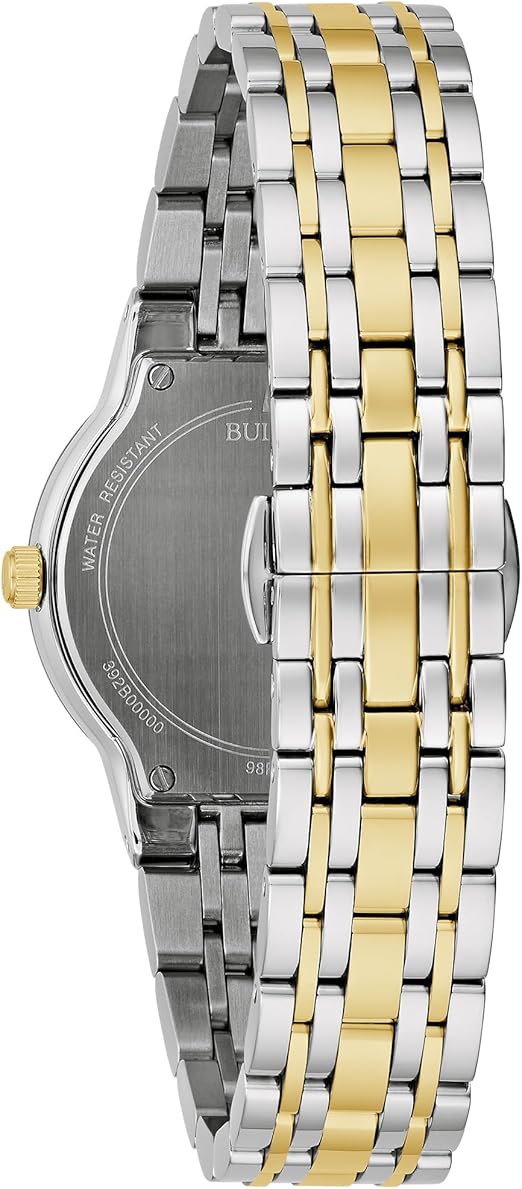 • This contemporary 30 mm two-tone stainless steel Bulova womens Modern collection timepiece features an ultra-slim 6.5 mm thickness and a refined matte gold-tone dial.