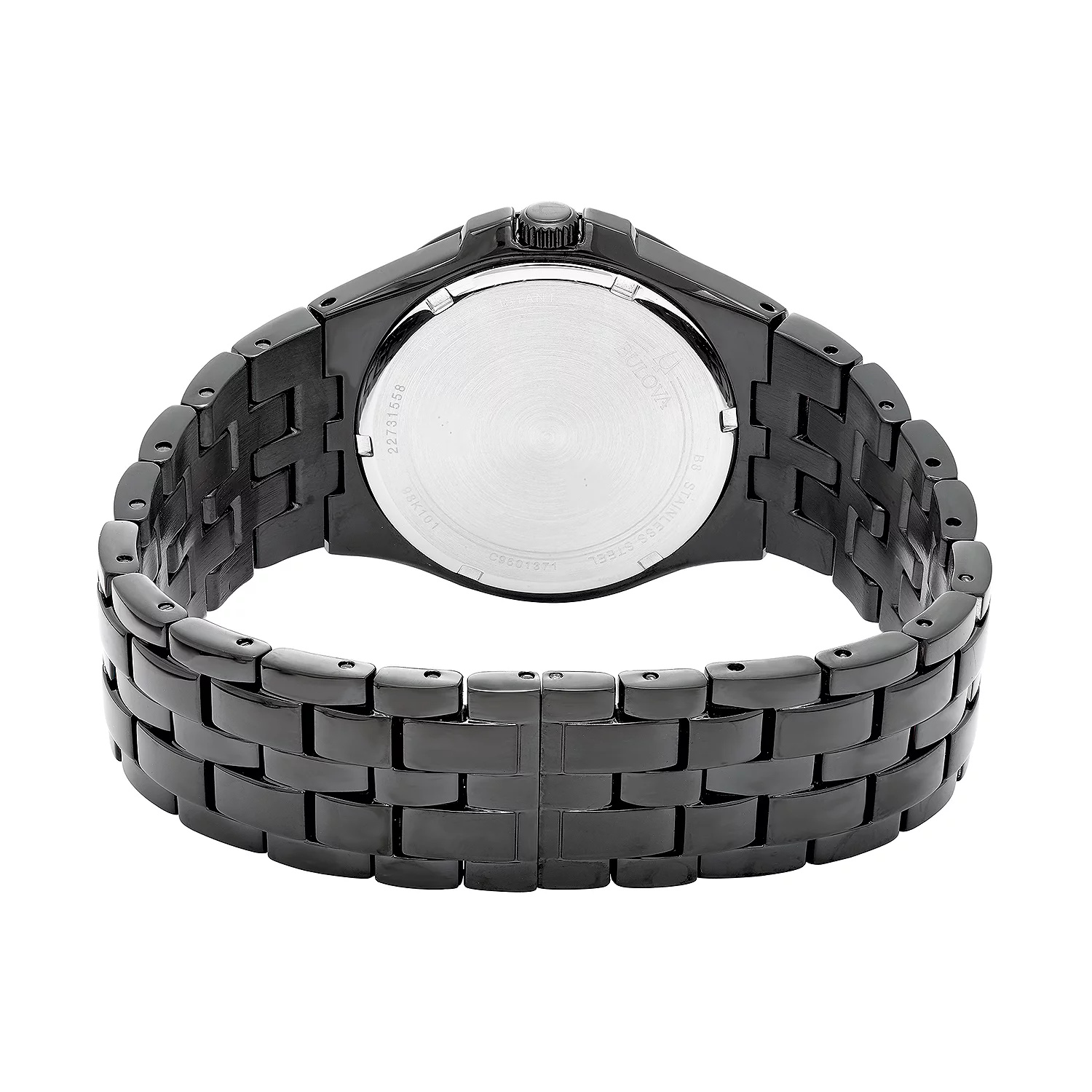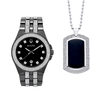 - Presented as a sleek boxed set including a matching crystal-traced dog tag this 42 mm black ion-plated stainless steel Bulova timepiece features a 10 mm thickness and is heavily embellished with pave crystals across the dial bezel and bracelet.