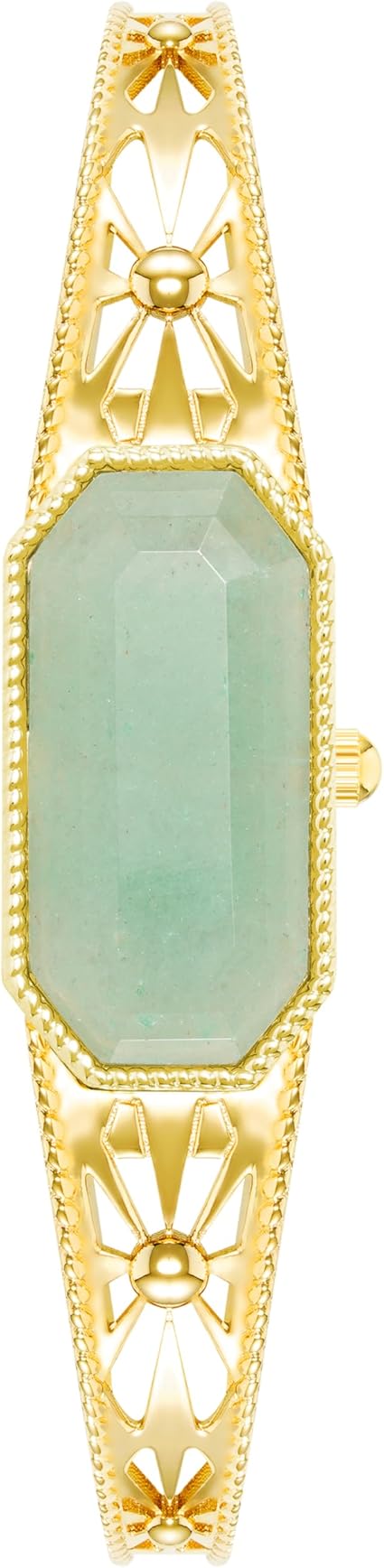 - This striking 28 mm octagonal metal timepiece features a unique 7 mm slim profile and a dial uniquely covered by a faceted cut genuine Aventurine gemstone creating a deep and shimmering emerald-like effect.