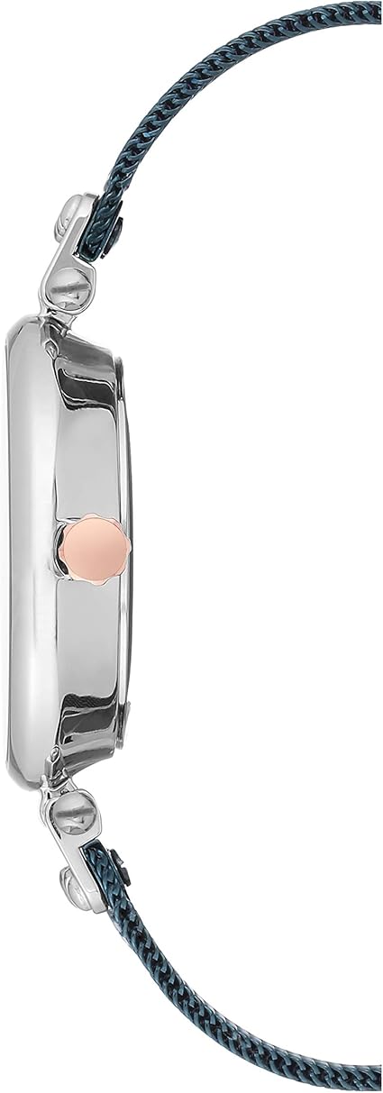 - This dress style watch features a round 34mm case crafted from blue tone metal with a 9mm thickness.