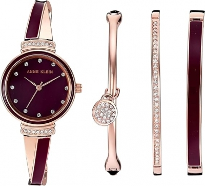 Anne Klein Rose Gold-Tone Burgundy Dial Crystal Lugs Bangle Set Ladies Watch AK/2716RBST