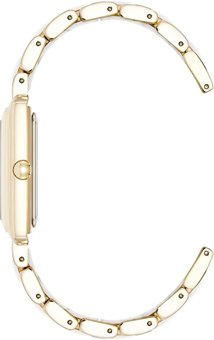 - This graceful 26 mm rectangular metal case watch features an 8.5 mm thickness and a polished gold tone finish centered on a luminous mother of pearl dial with gold tone hands and markers.