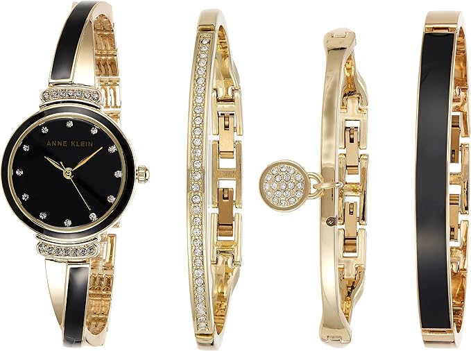- This set is completed by three matching gold tone bangles: one with black enamel filling one set with premium crystals and one featuring a crystal accented charm.
