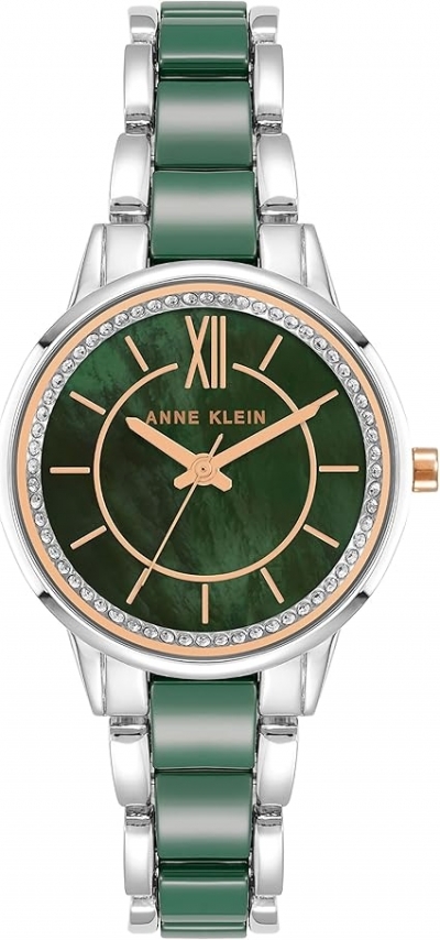 Anne Klein Silver-Tone Green Mother-of-Pearl Crystal Bezel Ladies Watch AK/3345GNRT
