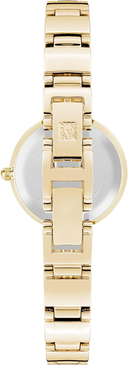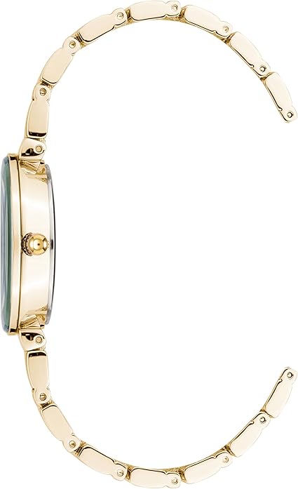 • It is paired with a 12 mm wide gold tone adjustable link bracelet that secures with a jewelry clasp and extender for a tailored fit.