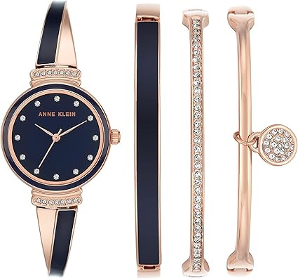 • While this model is not water resistant and does not include day date or chronograph functions it comes as a comprehensive four piece set including a navy blue enamel bangle a crystal set bangle and a crystal accented charm bangle.