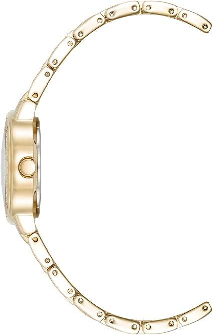 • This ultra glamorous 26 mm round metal case watch features a slim 8 mm thickness and a high shine gold tone finish defined by a case set with 52 clear premium crystals and a domed mineral crystal lens.