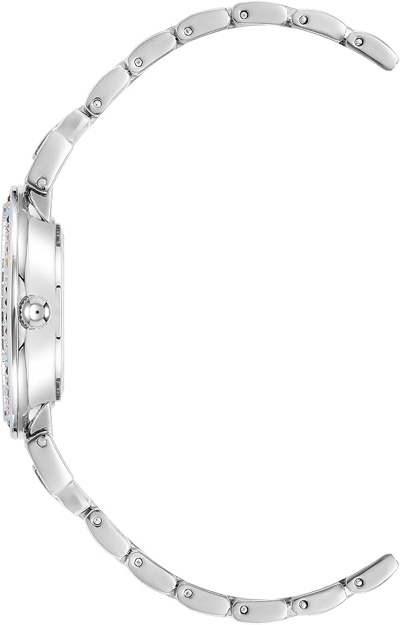 - This vibrant 30.7 mm silver-tone metal timepiece features a slim 7.3 mm thickness and a striking bezel set with 52 high-quality rainbow-colored crystals.