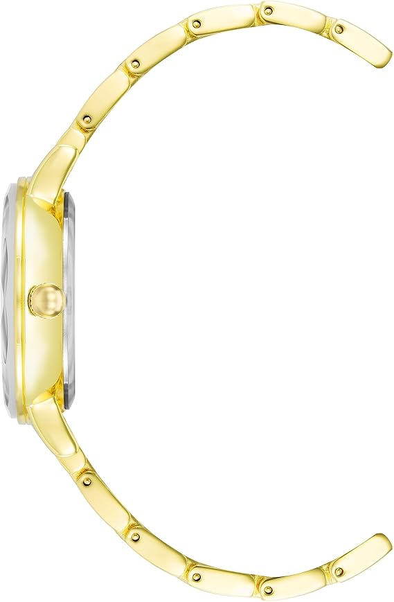 - The light champagne sunray dial provides a radiant backdrop for a genuine diamond at the 12 o clock position complemented by gold-tone hands and markers and driven by a precise Japanese quartz movement.