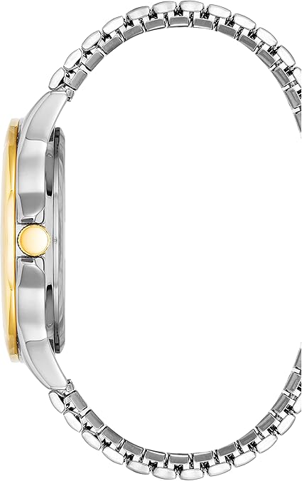 - Protected by a flat mineral crystal lens and a gold-tone bezel it is powered by Japanese quartz movement and is water-resistant to 165 feet (50M).