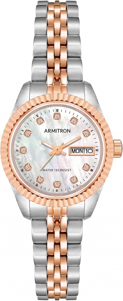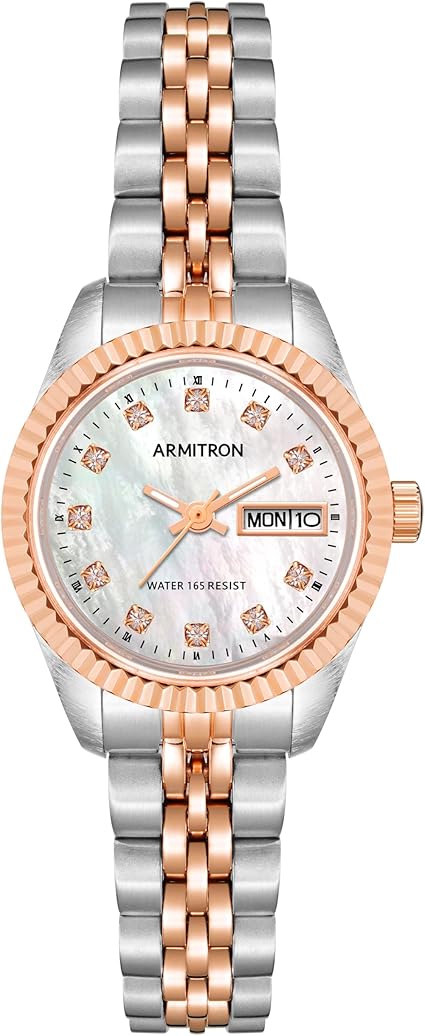 - An elegant 24.5mm watch featuring a mother-of-pearl dial with genuine crystal markers and a day/date calendar window.