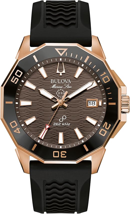 - The Bulova Marine Star Precisionist 98B421 is a high-performance sport watch featuring a rugged angular 43 mm rose gold-tone stainless steel case paired with a durable brown silicone strap.