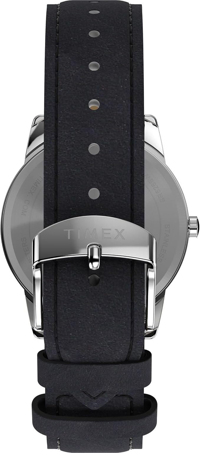 - The Timex watch features a classic 35 mm brass case material and silver-tone case color in a traditional round watch shape with a refined 8 mm case thickness.